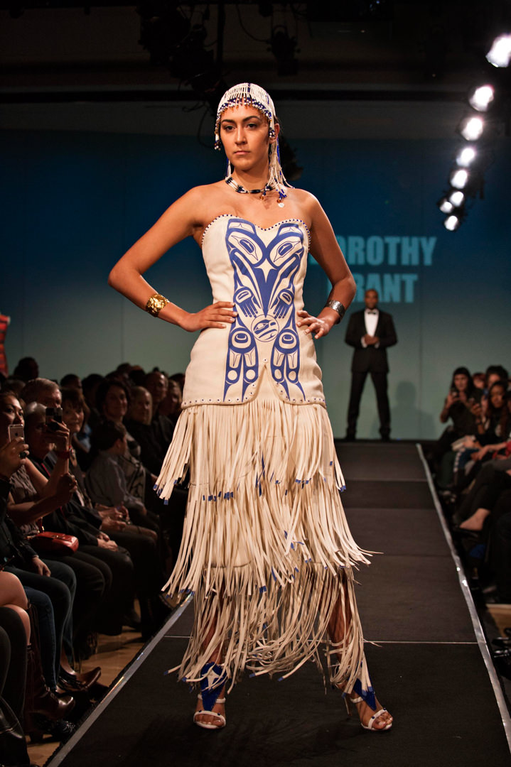 Sewing since the age of 13, Grant knew this was her calling and enrolled in the Helen Lefeaux School of Fashion Design. Her first label, Feastwear, debuted in 1989 with a Vancouver fashion show that featured 55 pieces with modern silhouettes, hand-appliquéd with Northwest Coast formline elements.
