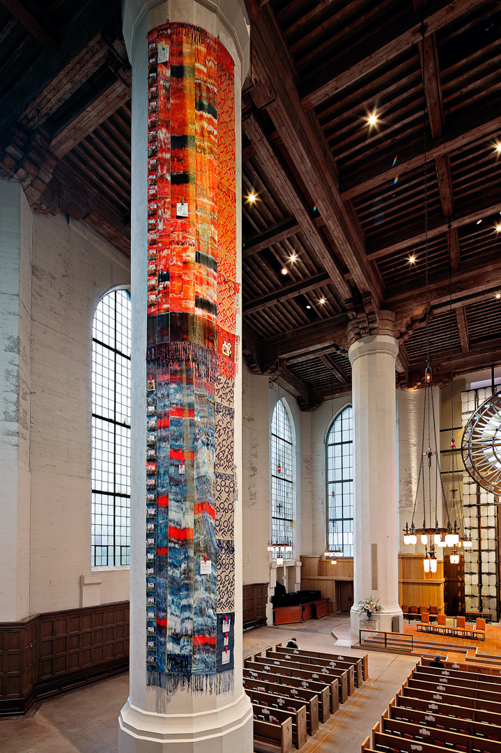 Faught’s Sanctuary (2017), a giant tapestry commissioned for the city’s Episcopal cathedral, Saint Mark’s, is over 45 feet high, made of hand-dyed cotton, hemp and gold lamé, stuffed with queer-themed DVDs, magazines, sheet music, giant clothespins, and images of spiritual and religious devotion. The 46 year-old artist, who teaches at the California College of the Arts, constructed the work over a period of months, fastening it to an interior column of the cathedral before it was donated to the Henry by William and Ruth True, the original patrons. Faught is a graduate of Oberlin College, the School of the Art Institute of Chicago, and the Fashion Institute of Technology in New York.