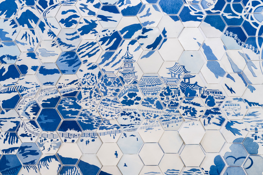Tam explores how certain ideas and images of Chinese cultural communities are shaped and spread through popular culture, racial stereotypes and exoticizing the East. For example, From Yiwu to You is an ongoing large-scale installation of faux Delftware tiles made from sheets of cyanotype to resemble European porcelain rooms inspired by a period of increasing trade with China. The invention of Delft pottery in the mid-1600s was a response to the popularity of Chinese blue-and-white porcelain. As in other works by Tam, these Eastern-influenced aesthetics and commercial ventures become an appropriated or an exotic version of China.