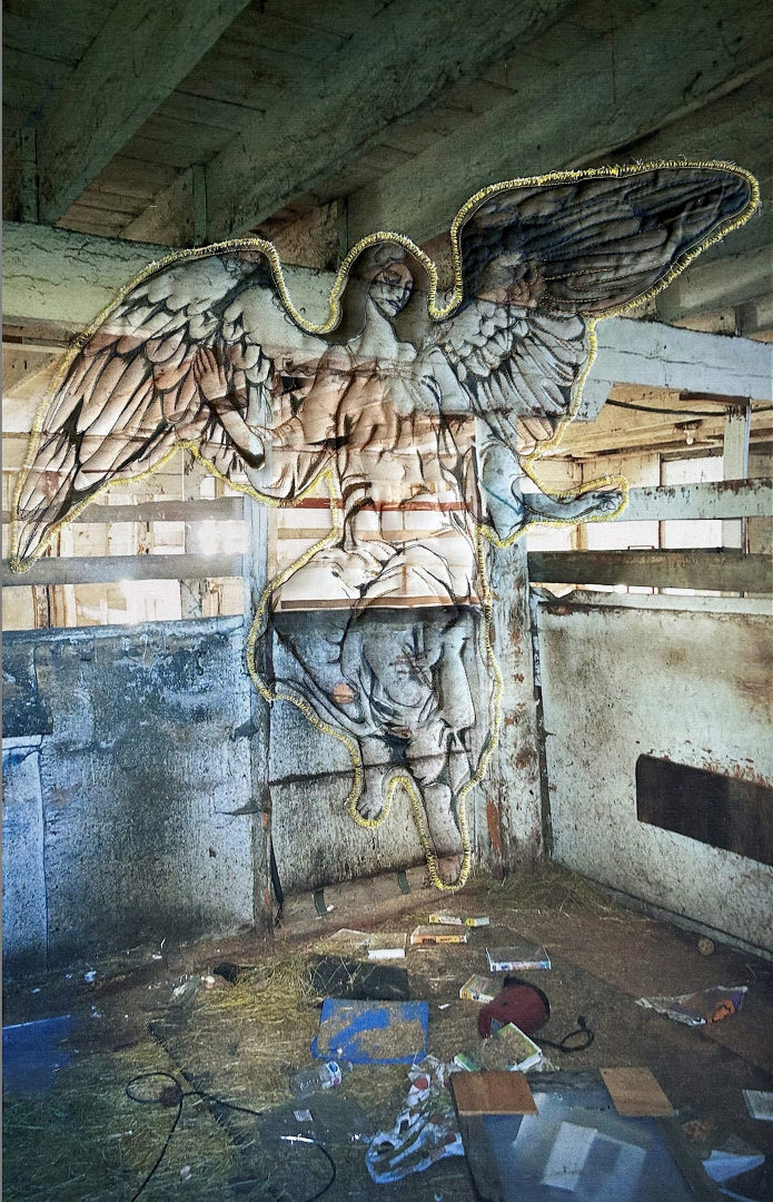 In this breakthrough exhibition, Maya Beaudry presents a series of wall works that combine printmaking, photomontage, painting, machine sewing and appliqué. The settings for many of these works are nesting stations, though not like those found in lifestyle magazines. Three feature barns: two with high, heavenly, cathedral-like ceilings, while the third is more abject, closer to a junkie’s manger. Attending to many of the wall works are painted angels, often outlined in white–some figurative, others amorphous. evergreenculturalcentre.ca/exhibit